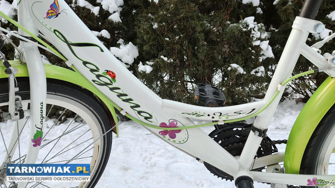 Sprzedam widoczny na zdjęciach rower Kands Laguna na kołach 24 cale. Rower typu damka dziewczęcy. Hamulce, przerzutki i oświetlenie sprawne. Bagażnik, dzwonek, światełka na baterie. Kolor biały metalik plus zielony. Odbiór wyłącznie osobisty Lisia Góra ul Długa 39A