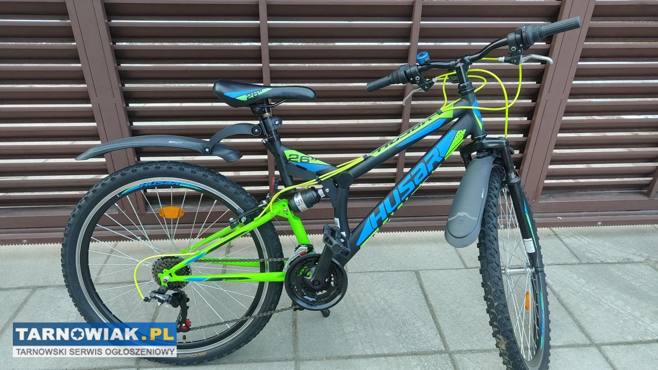 Sprzedam widoczny na zdjęciach rower Husar na kołach 26 cali. Rama w rozmiarze 17 cali, amortyzator centralny. Rower w bdb stanie, nie poobijany. Kolor czarny mat plus niebieskie i neonowe wstawki. Odbiór wyłącznie osobisty Lisia Góra ul Długa 39A