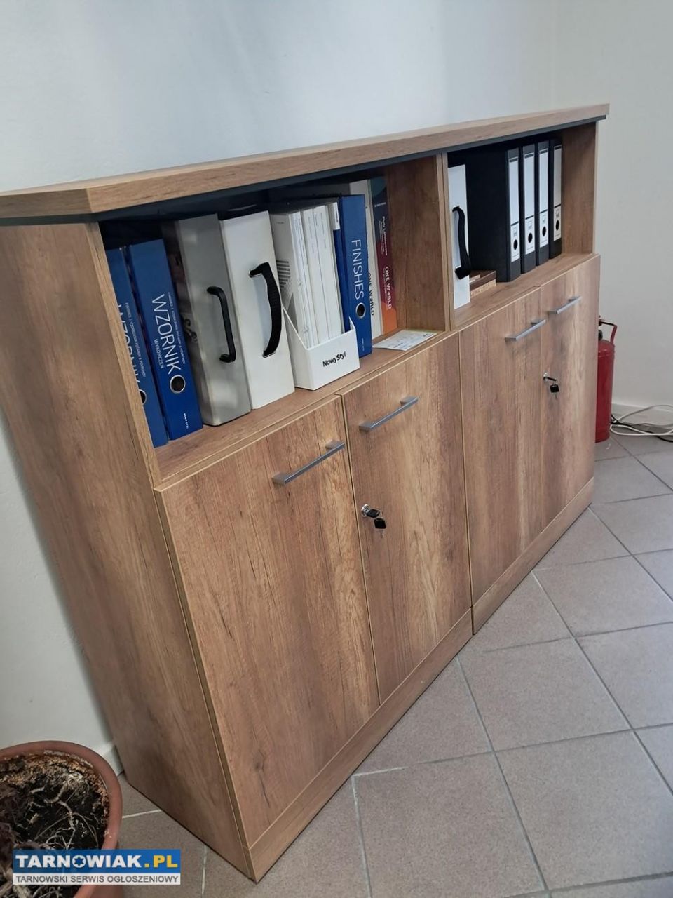 W skład zestawu wchodzi biurko 140x80x74 cm , zestaw regałów zamykanych 160x40x121 cm oraz kontener pod biurkowy z centralnym zamkiem .
