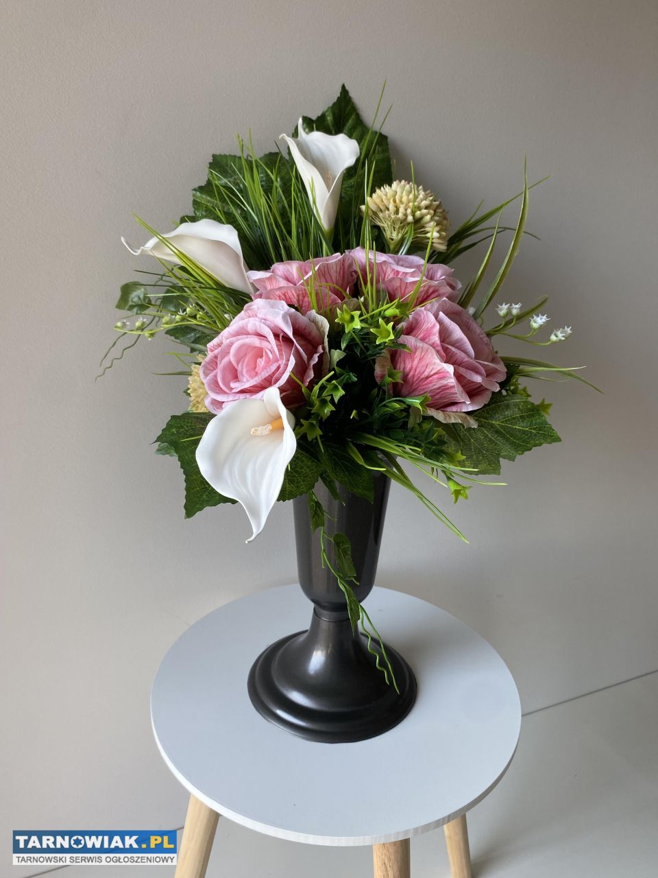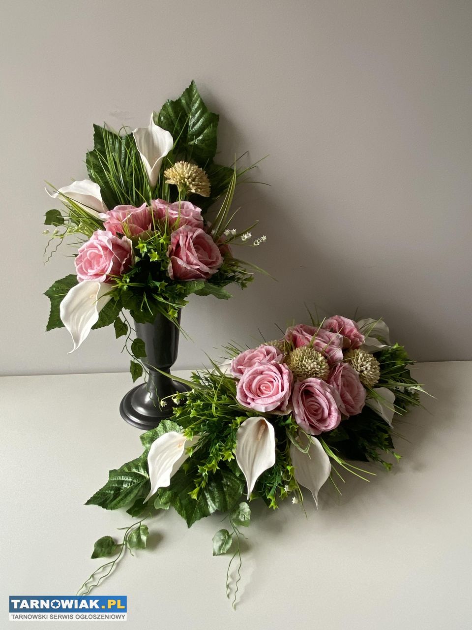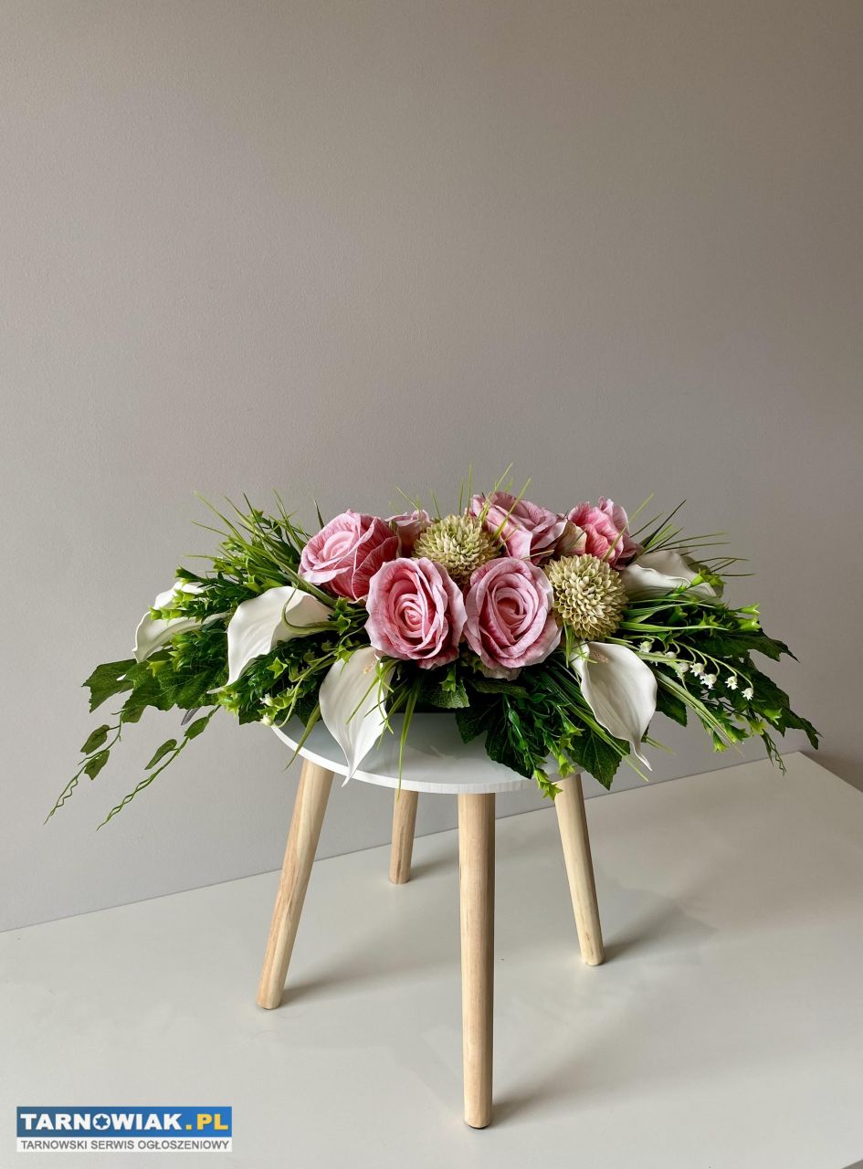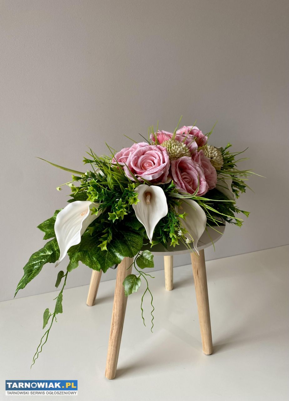 Ręcznie wykonany elegancki zestaw kwiatów na cmentarz - róże i kalie. Kompozycja składa się z różowych róż, białych kalii oraz zielonych liści, tworząc piękną i harmonijną całość. Idealny na grób lub jako ozdoba na uroczystości pogrzebowe.