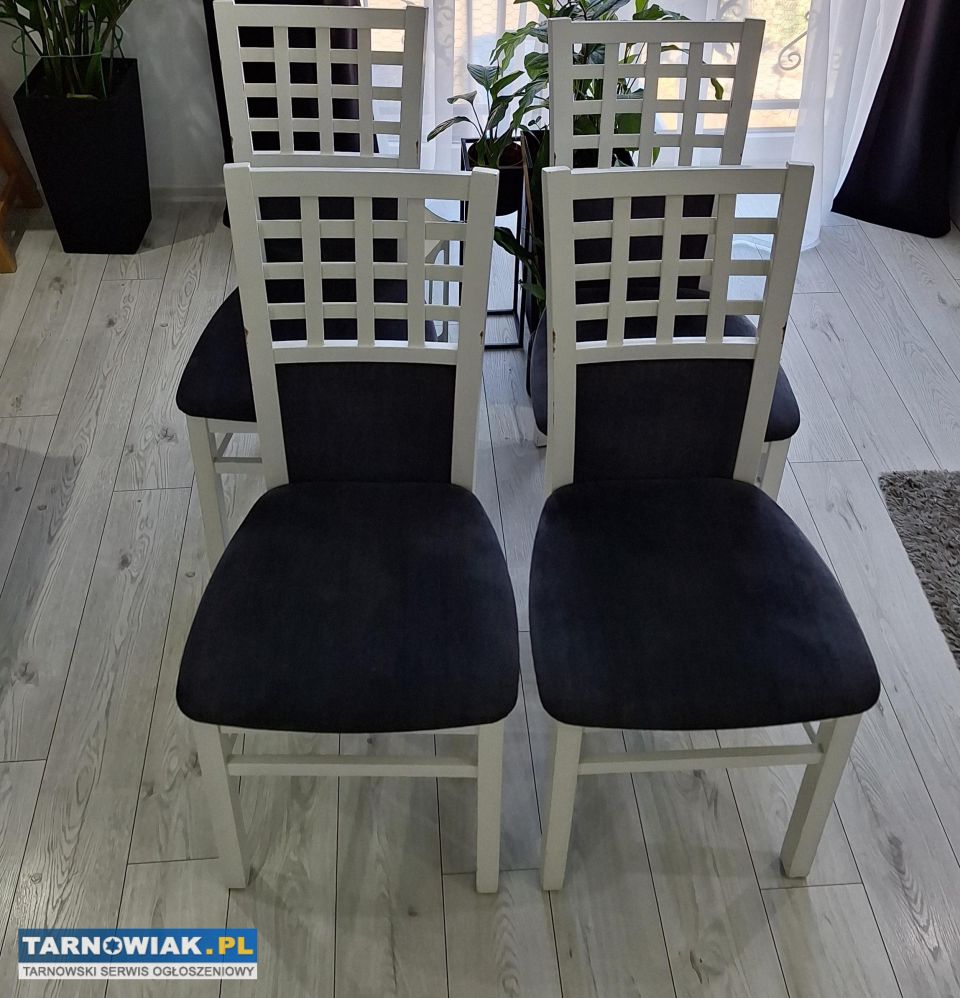 Zestaw 4 białych krzeseł do jadalni z szarym obiciem siedziska. Krzesła sprawne, solidne. Jedyny minus to obicia na białej ramie (zawsze można odmalować). Materiał siedziska nienaruszony.