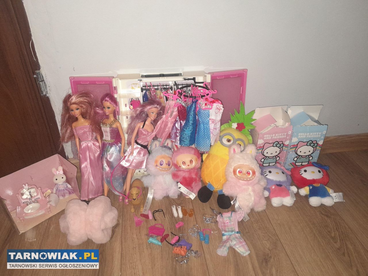 Witam sprzedam zabawki: szafa dla lalek + 3 lalki z ubrankami I akcesoriami. Pluszak ananas i labubu, nauszniki różowe. Zabawki w bardzo dobrym stanie.