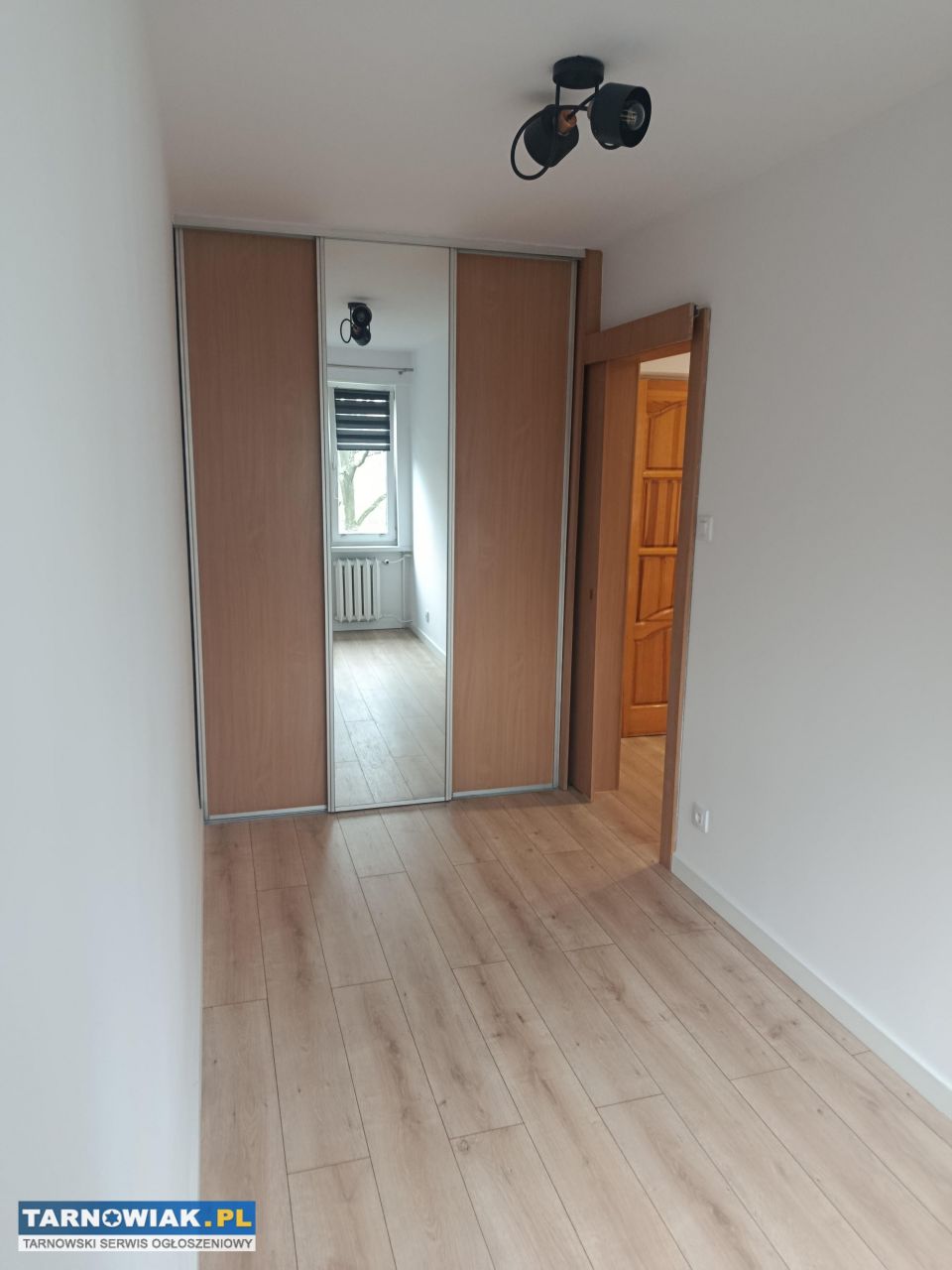 Sypialnia wyposażona w dużą szafę przesuwną z lustrami–na podłodze panele.Do mieszkania przynależy również piwnica.