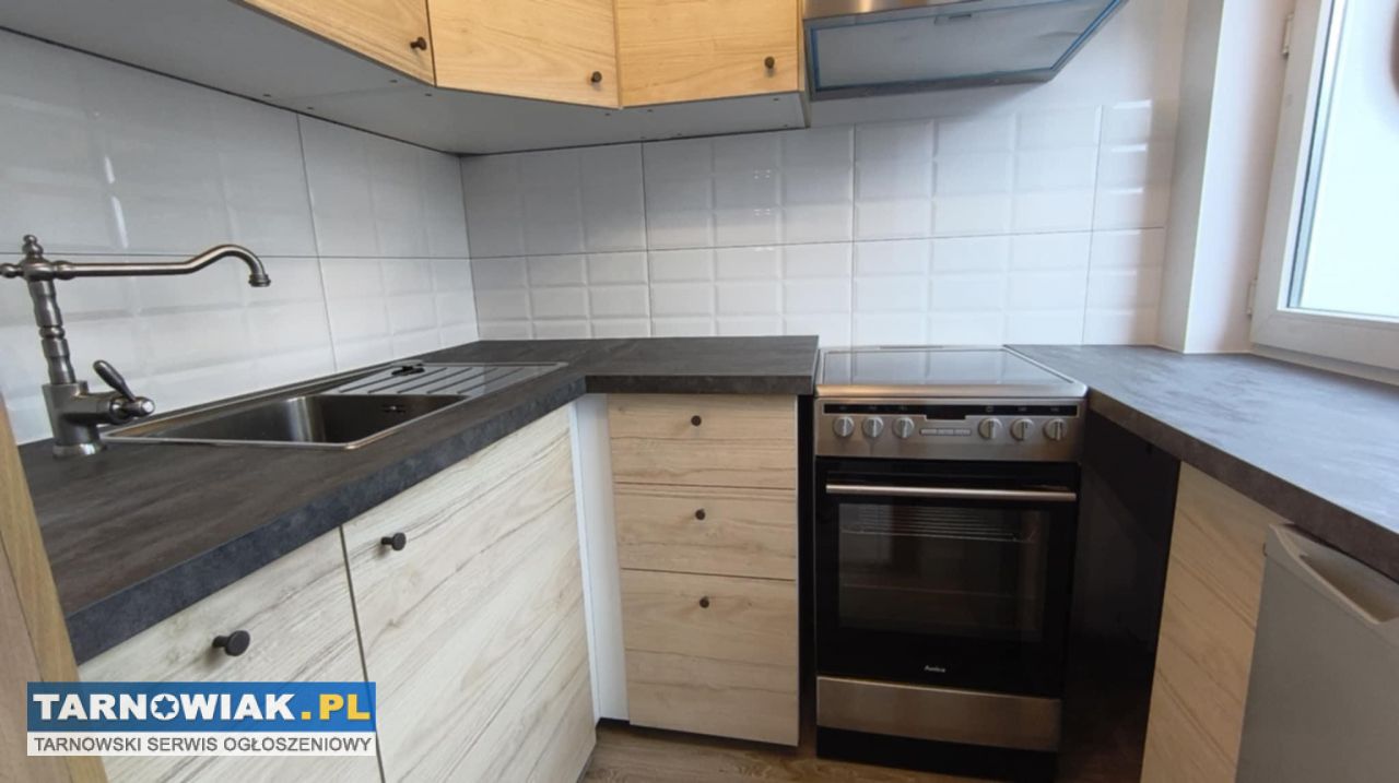Mieszkanie jest częściowo umeblowane.W całości wyposażona jest kuchnia,w której mieści się okno dające dużo światła, szafki kuchenne oraz sprzęty takie jak kuchenka gazowa, lodówka.Podłoga wyłożona panelami wysokiej jakości.