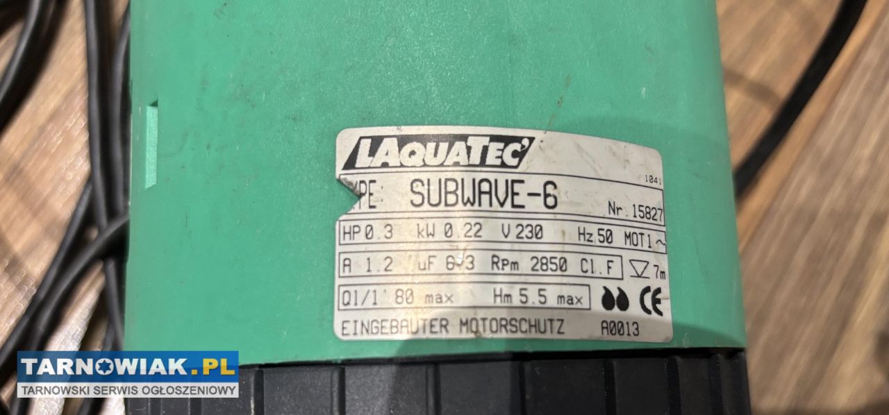 Sprzedam używaną pompę wodną Laquatec. Obiór w Lipinach gm. Dąbrowa Tarnowska lub w Tarnowie po wcześniejszym umówieniu. Zapraszam