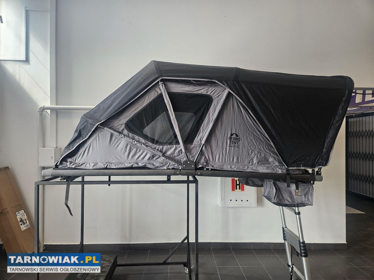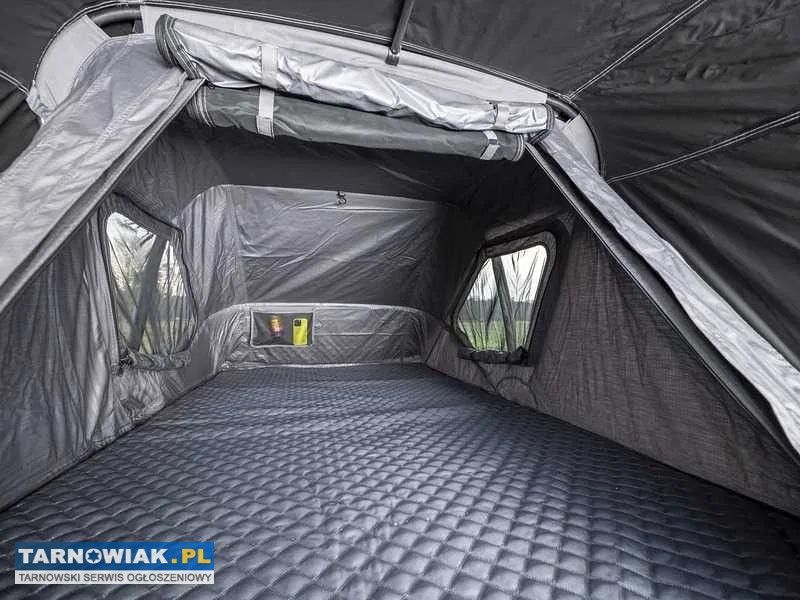 Namiot dachowy o nowej konstrukcji do ręcznego rozkładania - odpowiedni do samochodów osobowych, dostawczych i SUV-ów. Namiot dachowy można szybko rozłożyć. Jest wyposażony w moskitiery we wszystkich otworach (z 3 stron), 2 praktyczne kieszenie na buty przy wejściu zewnętrznym, wygodny materac o grubości 7 cm i aluminiową drabinkę teleskopową. Podstawa składa się z wytrzymałej aluminiowej ramy.