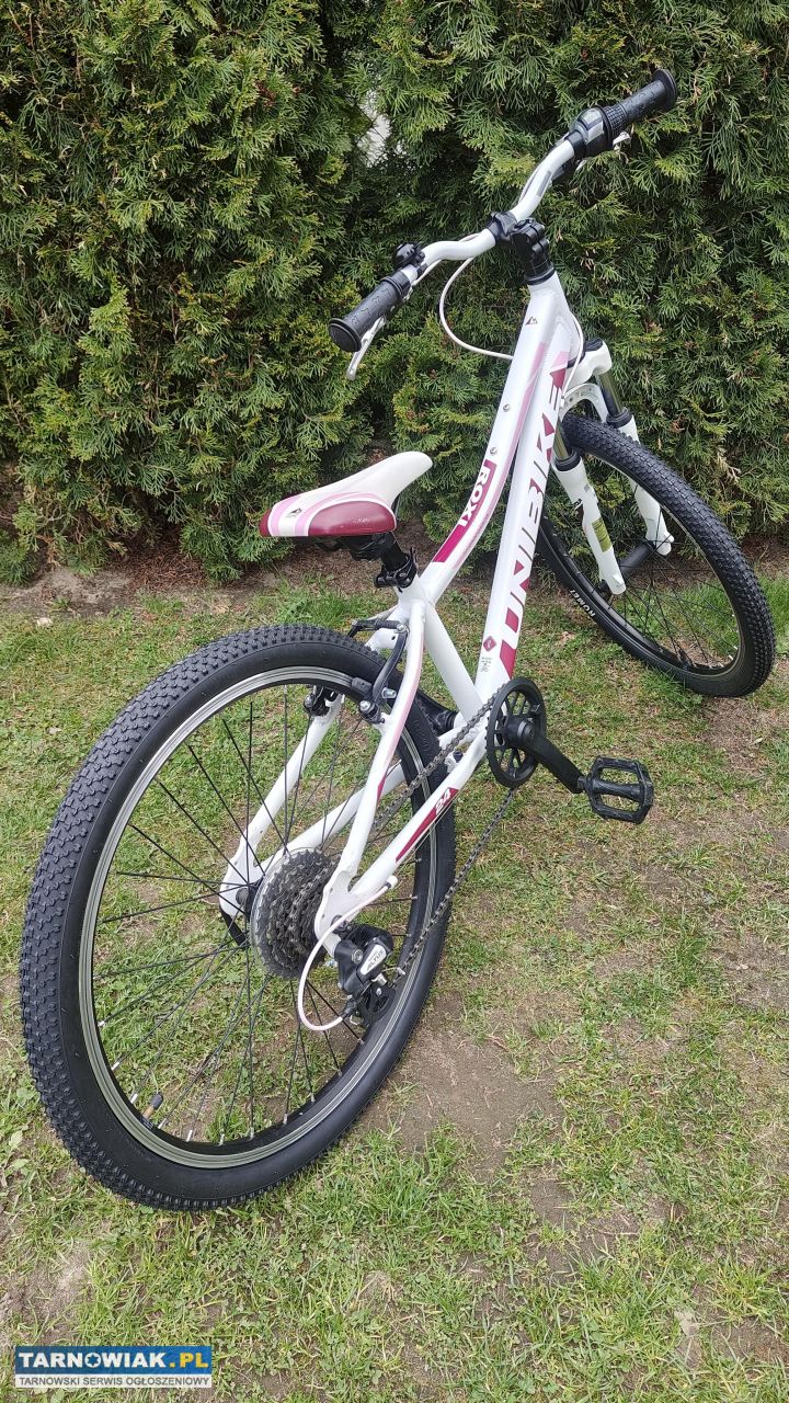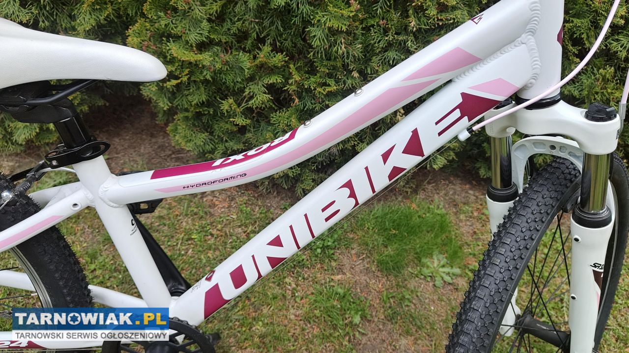 Sprzedam widoczny na zdjęciach rower Unibike Roxi na kołach 24 cale, dziewczęcy. Aluminiowa lekka rama w rozmiarze 11 cali, nowe opony Deestone, przerzutka Shimano Altus 1x8 sprawna, hamulce i amortyzator sprawne, dzwonek. Rama nie poibijana. Kolor biały mat plus różowe i bordowe wstawki. Odbiór wyłącznie osobisty Lisia Góra ul Długa 39A