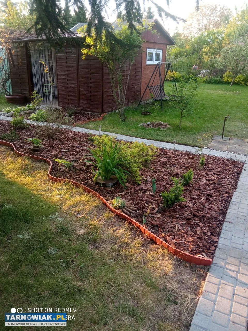Jest ogrodzona, domek z zadaszonym tarasem, narzędziownia oraz WC.