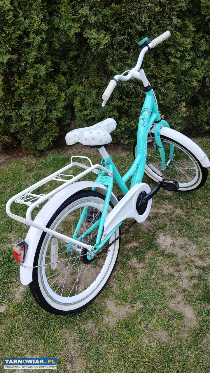 Sprzedam widoczny na zdjęciach rower Kands Diana na kołach 20 cali produkcji polskiej. Rama w rozmiarze 12 cali, siodełko jest nowe, hamulce sprawne, oświetlenie sprawne, bagażnik, dzwonek, błotniki. Rower w bdb stanie. Kolor miętowy plus biale wstawki. Odbiór wyłącznie osobisty Lisia Góra ul Długa 39A